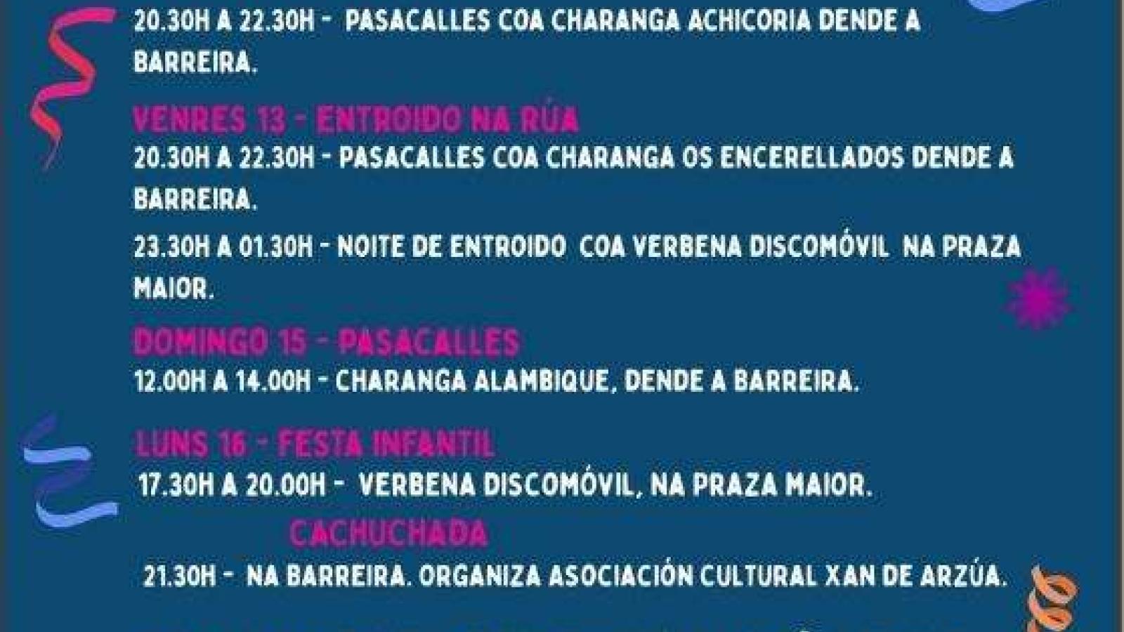 Viernes 13, a las 20.30 horas pasacalles con la charanga Os Encerellados desde A Barreira. A las 23.30 horas, Noite de Entroido con la Verbena discomóvil en la Praza Maior.