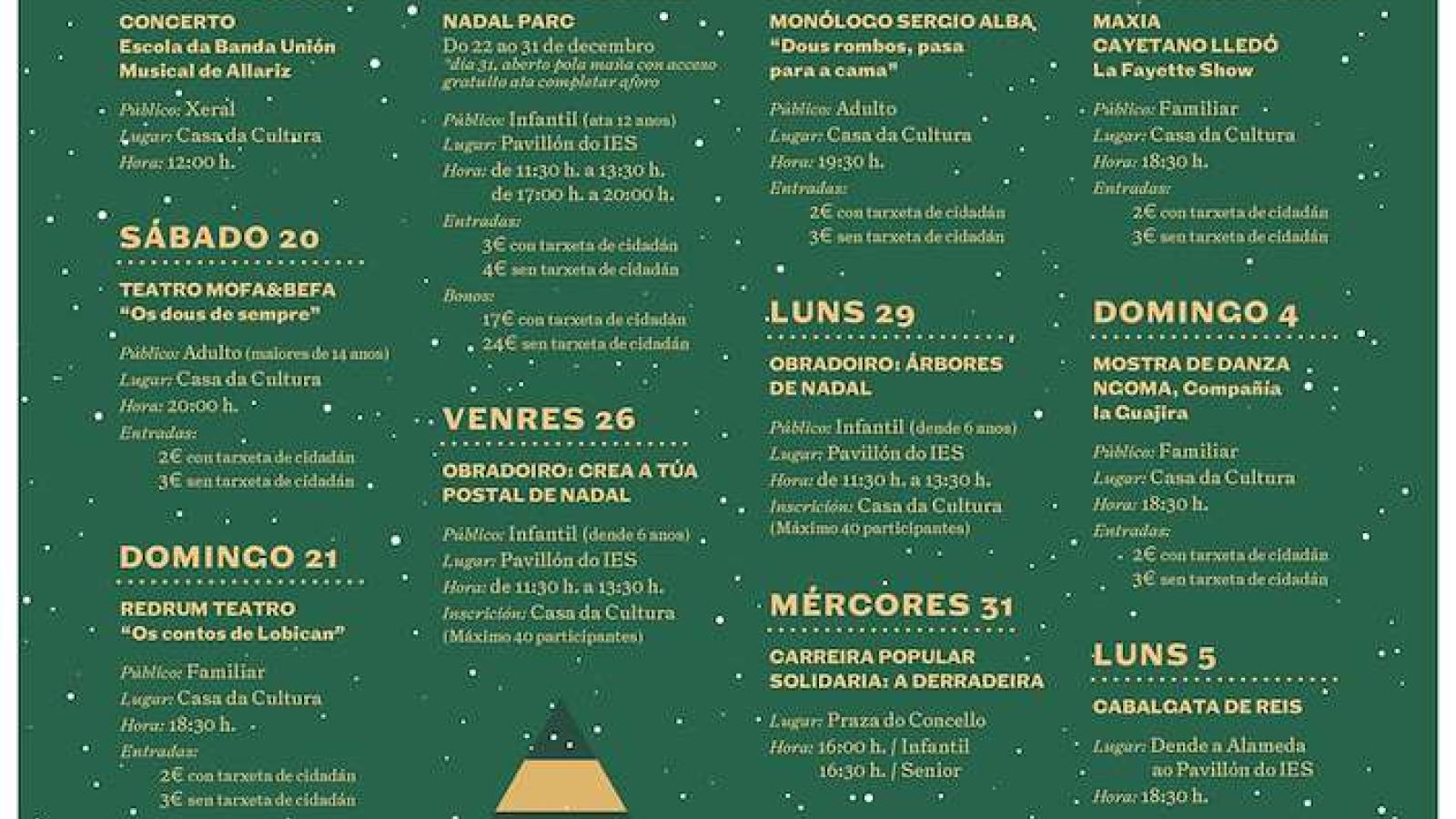 El sábado 20 de diciembre tendrá lugar la obra de teatro "Os Dous de Sempre" de Teatro Mofa&Befa en la Casa da Cultura aals 20.00 horas. En la jornada del domingo 21 tendrá lugar la obra "Os contos de Lobican" con Redrum Teatro.